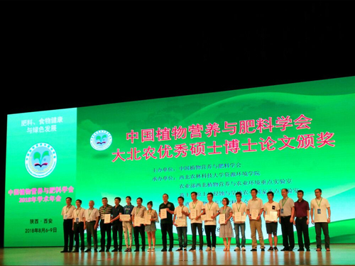 本次年会的会议主题是“肥料、食物健康与绿色发展”,会议设立了1个主会场、10个分会场及“一带一路”肥料科技创新与国际合作论坛,交流形式包括大会报告、分会场报告和墙报交流。年会开幕式上,中国植物营养与肥料学会向获得大北农第二届优秀硕士学位论文的六位作者及其指导教师颁奖,重点实验室主任郜红建教授指导的硕士研究生陈晨同学获得了大北农第二届优秀硕士学位论文奖。