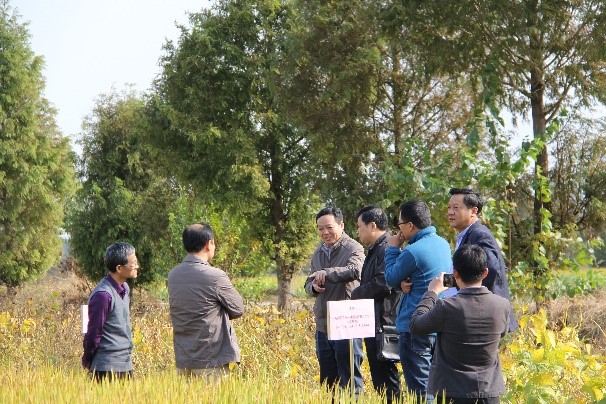 郜红建教授向各位与会专家介绍了作物秸秆还田后养分运筹与磷钾肥减施替代技术方案。专家组实地考察了试验地水稻生长情况,随机选择试验田块进行现场实收测产。经过现场考评,秸秆还田后磷肥和钾肥分别减量20%,水稻产量不会减产,减肥增效明显。
