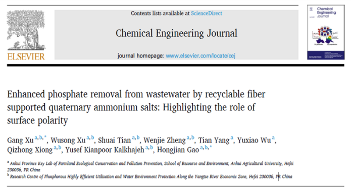 近日,国际高水平期刊Chemical Engineering Journal(中科院一区,IF =10.652)在线发表了我校资源与环境学院农田生态保育与污染防控安徽省重点实验室、长江经济带磷资源高效利用与水环境保护研究中心在磷素高效回收利用与污染防治方向题为“Enhanced phosphate removal from wastewater by recyclable fiber supported quaternary ammonium salts: Highlighting the role of surface polarity”的研究论文。该研究制备了系列季铵盐功能化纤维,用于去除与回收废水磷酸盐,徐刚副教授作为第一作者与通讯作者,郜红建教授为该文的共同通讯作者,安徽农业大学为第一单位。论文链接:https://doi.org/10.1016/j.cej.2020.127889。